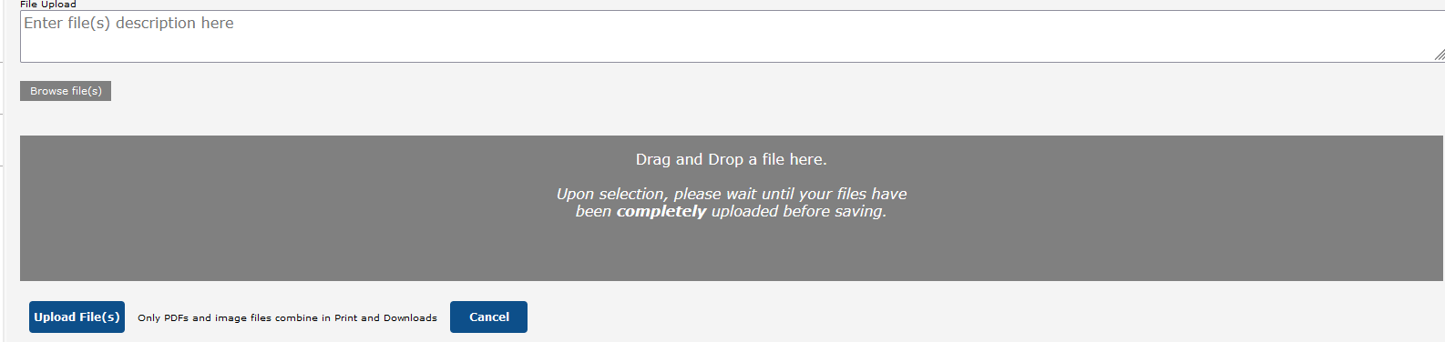Include file attachments by dragging and dropping into the box or using Browse File(s) and selecting Upload File(s). Additionally, existing document module folders and/or files can be "referenced" by using The Document Reference Tool.