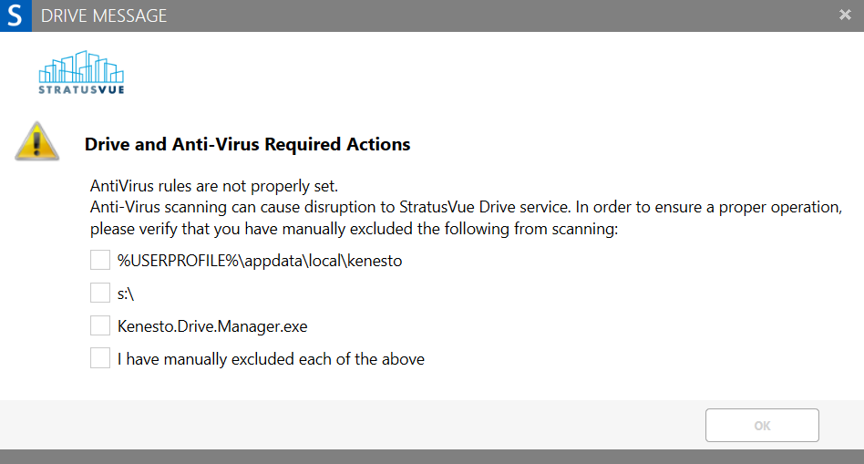 Important: This message will also be displayed on all new installations of the drive as a reminder the the exclusions will need to be set. If this message keeps showing, the exclusions have not been set properly by IT. Every anti-virus application
