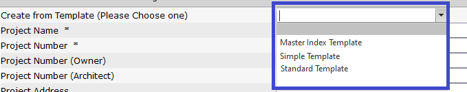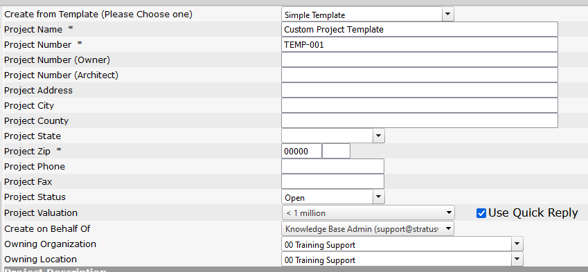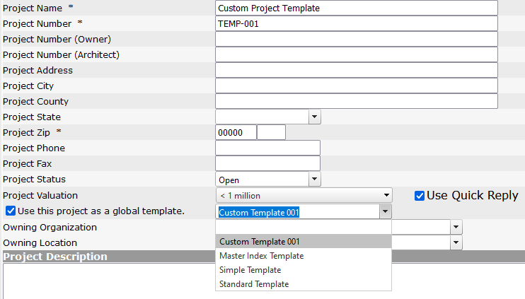 2. Assign the Project Template a Project Name, Project Number, and Project Zip. (These are the minimum required fields to create a new project, other fields can be populated as needed)