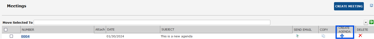 2. Select the Create Agenda button in the Meetings Grid on the meeting being converted