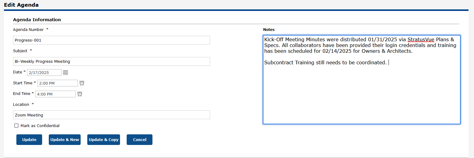 4. Select Update to Save the new Agenda created from a Meeting. The Agenda is now ready to be updated.