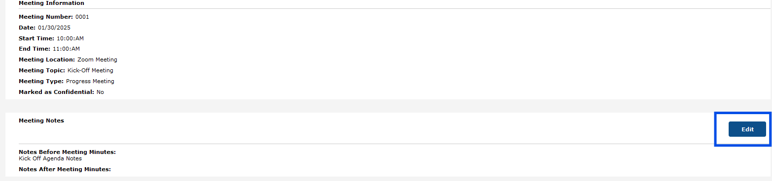 Once Meetings and Meeting Minutes have been established, they can be updated by users with the appropriate Project Member Permissions.