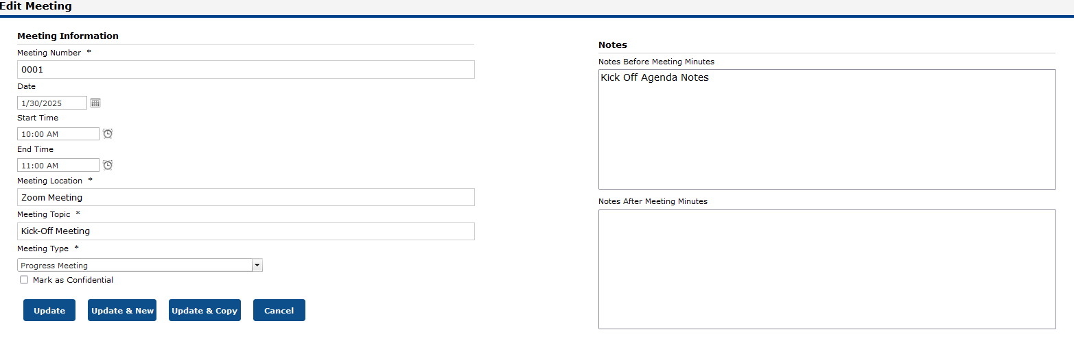 4. Select Update to save changes and condense the Meeting Details (Update & New will take the user immediately into the next Meeting for creation. Update & Copy will take the user immediately to the next Meeting for creation, but containing a copy of all of the details entered in the current Meeting Agenda being edited)