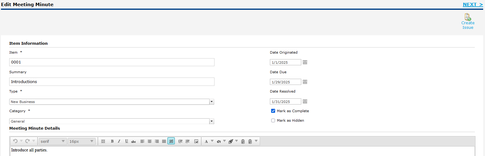 The only required field for a Meeting Minute is the Item Number, Item Type, and Item Category; all other fields are optional. The Summary field is important and should be included. The type and category dropdowns are populated by Project Level List Management. The date originated will default to the date that the agenda item is created. A due date and resolved date can also be included or updated later. Meeting Minutes can also be marked as complete. The Meeting Minute Details can be entered into the text box with the formatting toolbar.