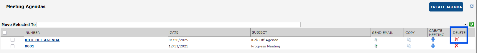 1. Navigate to the Meeting Agendas grid where the Meeting Agenda being deleted is located.