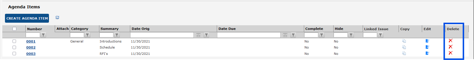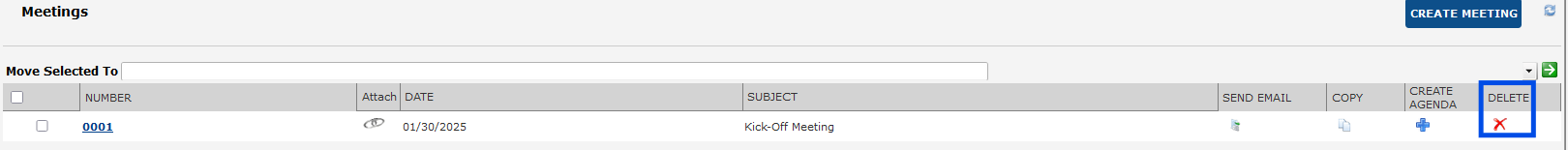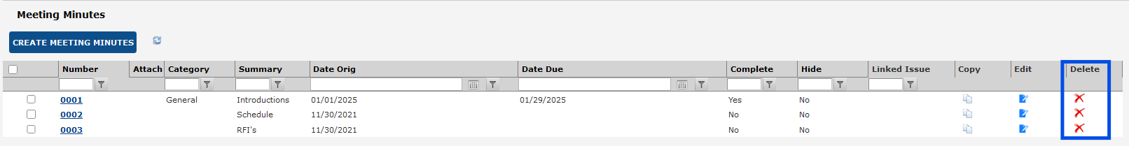 2. Select the Red X in the delete column to delete the Meeting Minute